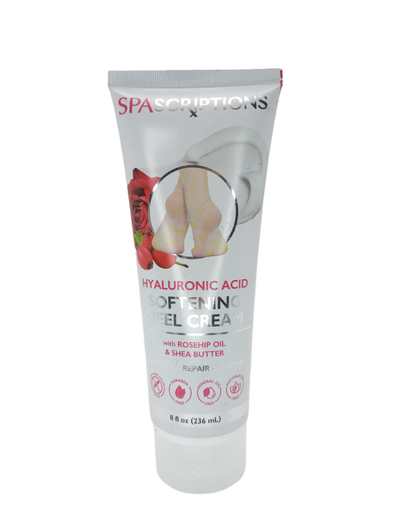 SpaScriptions T SOFENING HEEL CREAM es un lujoso spa en casa experiencia para tratar tus pies. Nuestra mezcla de humectantes y exfoliantes suaves hidrata y calma profundmente la piel seca y los talones agrietados. Tus pies se sentirán suaves, tersos y frescos.
